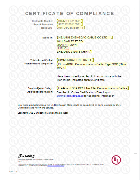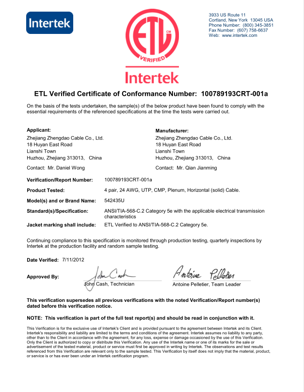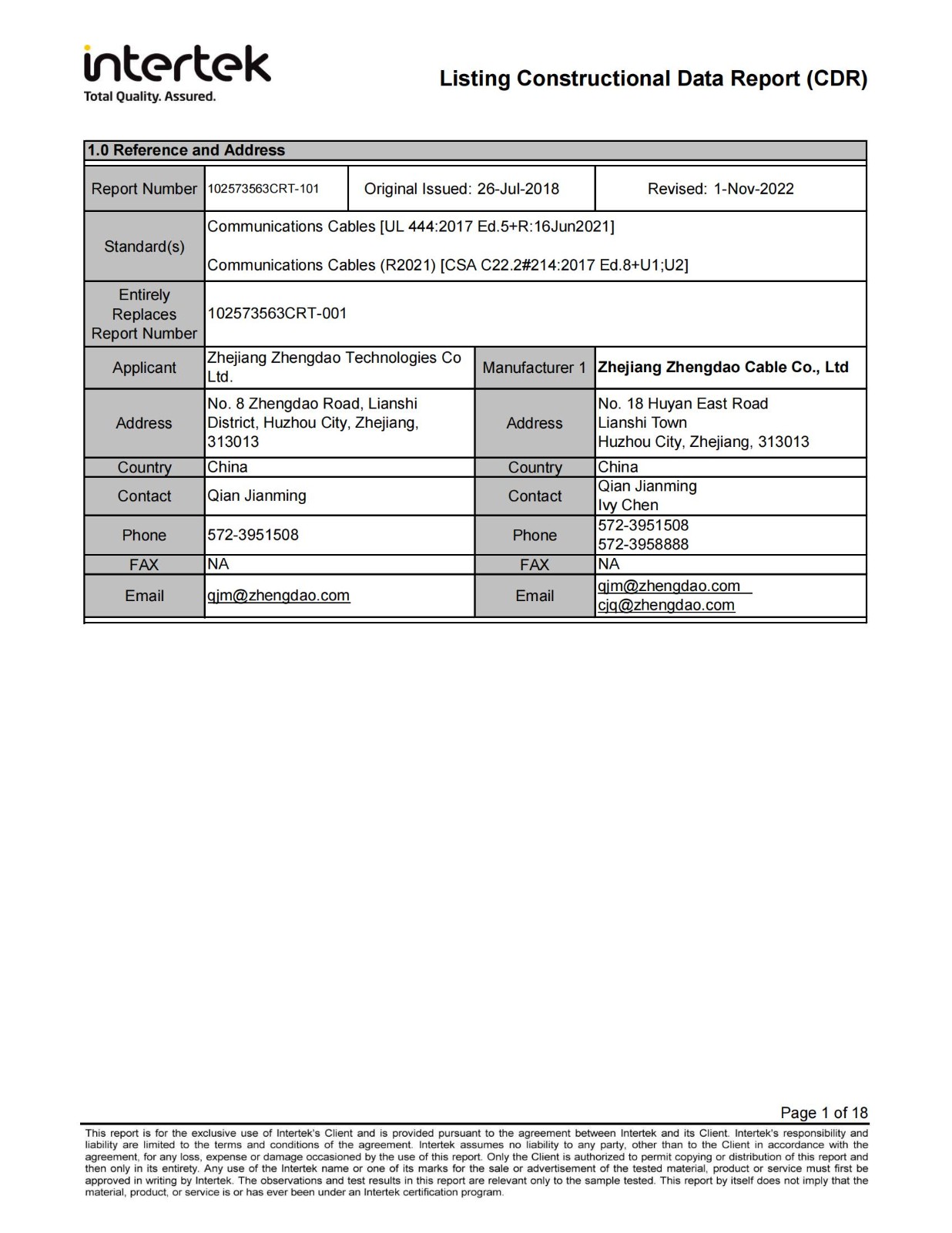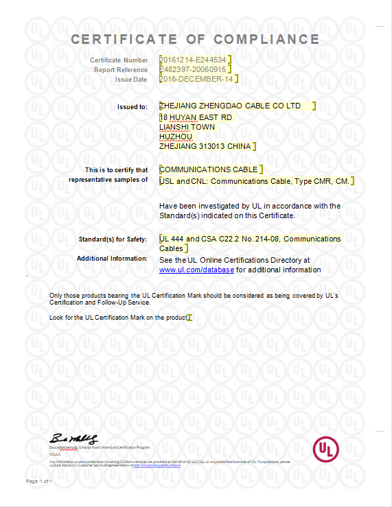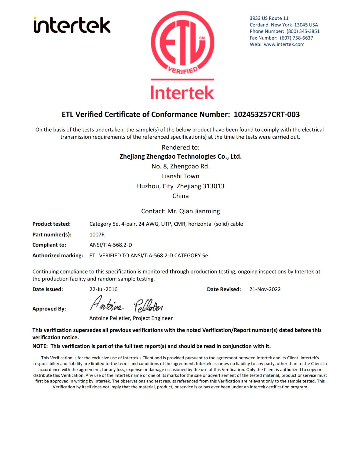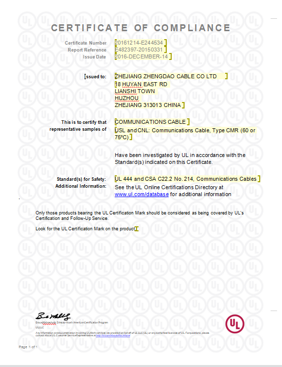 数字通信电缆 ETL 证书-CMR、CM、CMX、CMG